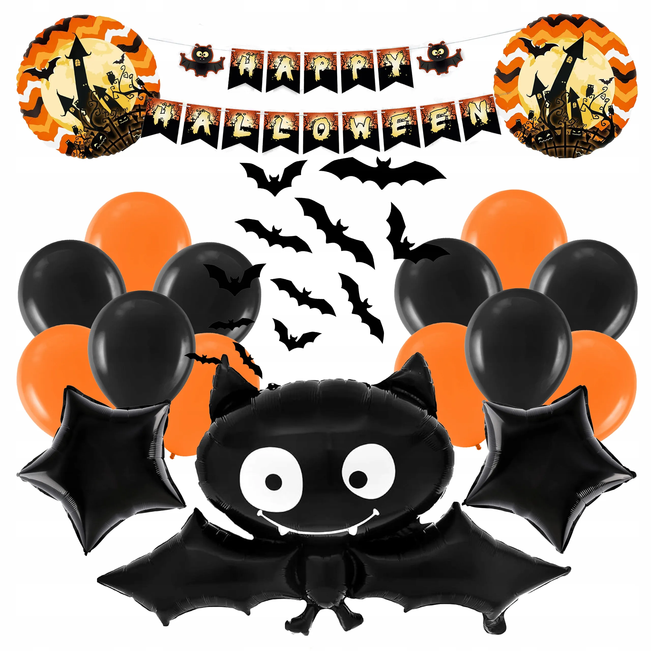 W zestawie znajdziesz wszystko, co niezbędne, aby szybko i łatwo udekorować pomieszczenie na Halloween. Duży balon w kształcie nietoperza, baner z napisem „Happy Halloween”, a także klasyczne balony w kolorach czarnym, pomarańczowym, a także naklejki nietoperze stworzą idealne tło do niezapomnianej zabawy..