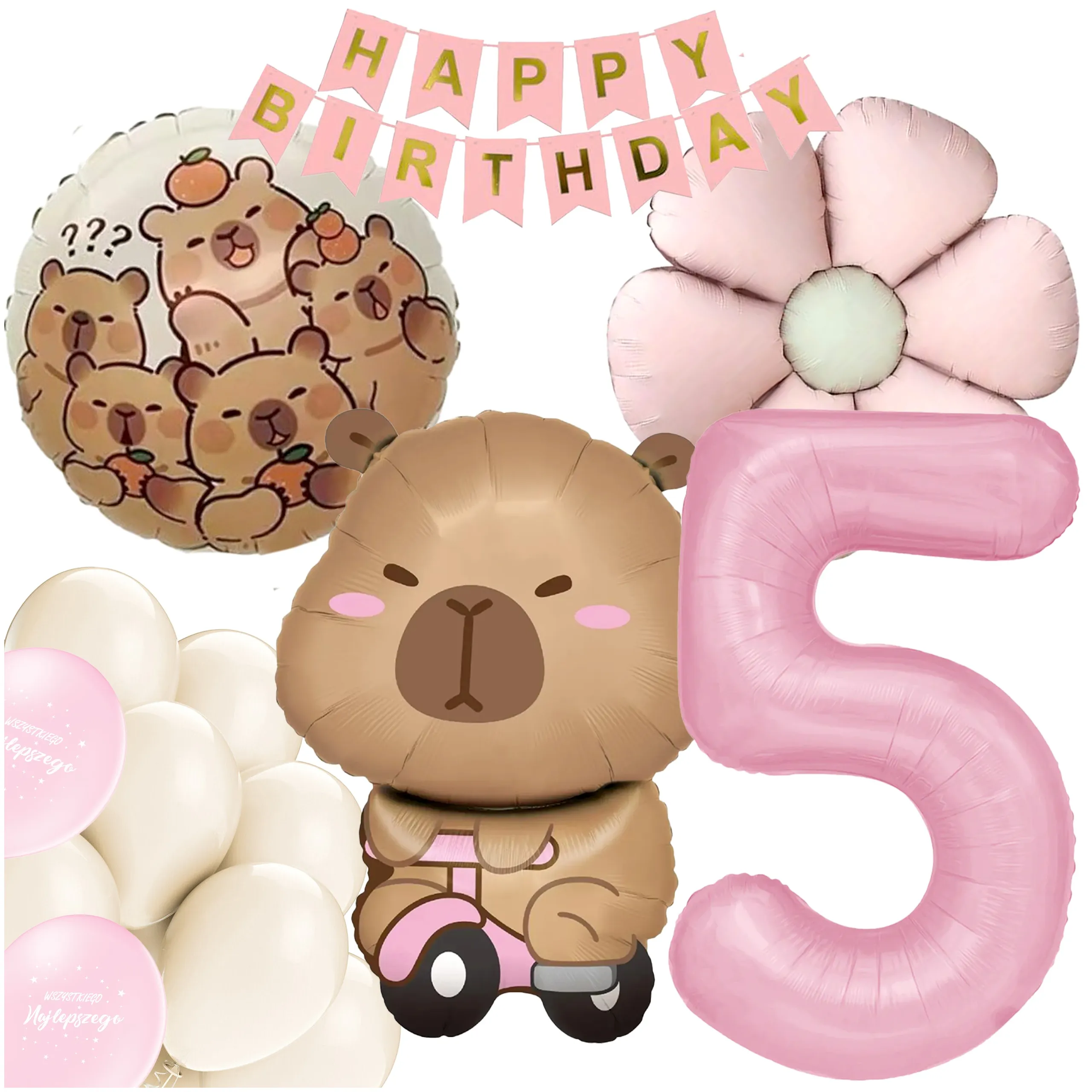 Strona główna » Dekoracje na uroczystość » ZESTAW BALONÓW KAPIBARA KWIATEK CYFRA 5