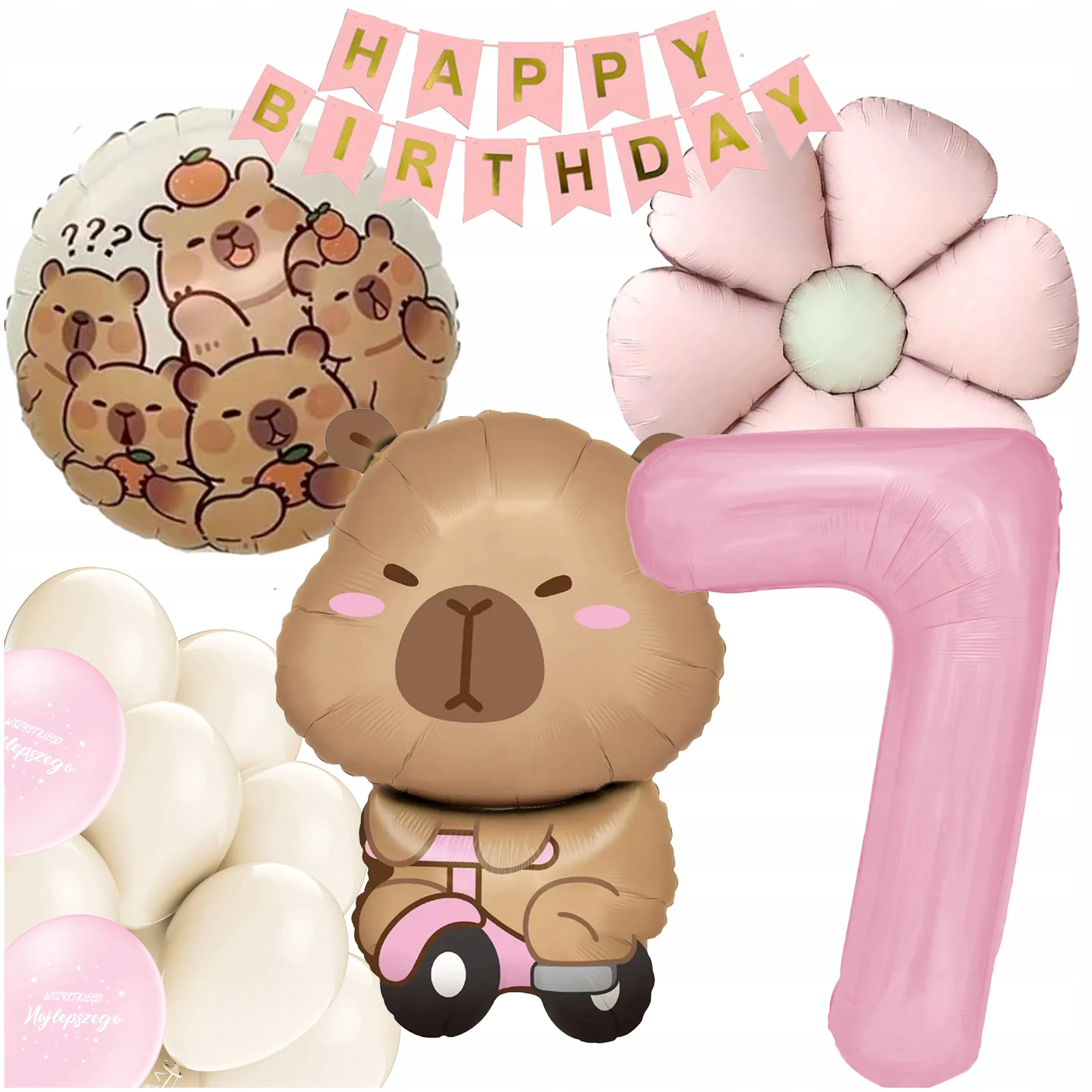 Strona główna » Dekoracje na uroczystość » ZESTAW BALONÓW KAPIBARA KWIATEK CYFRA 7