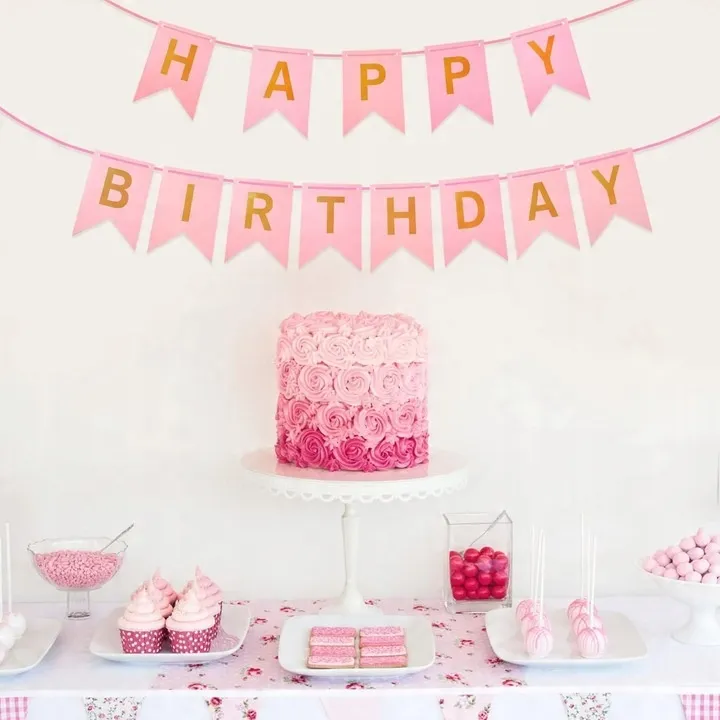 1 BANER urodzinowy - HAPPY BIRTHDAY (pastelowy różowy ze złotym nadrukiem, wymiary flag: 12 x 17 cm)